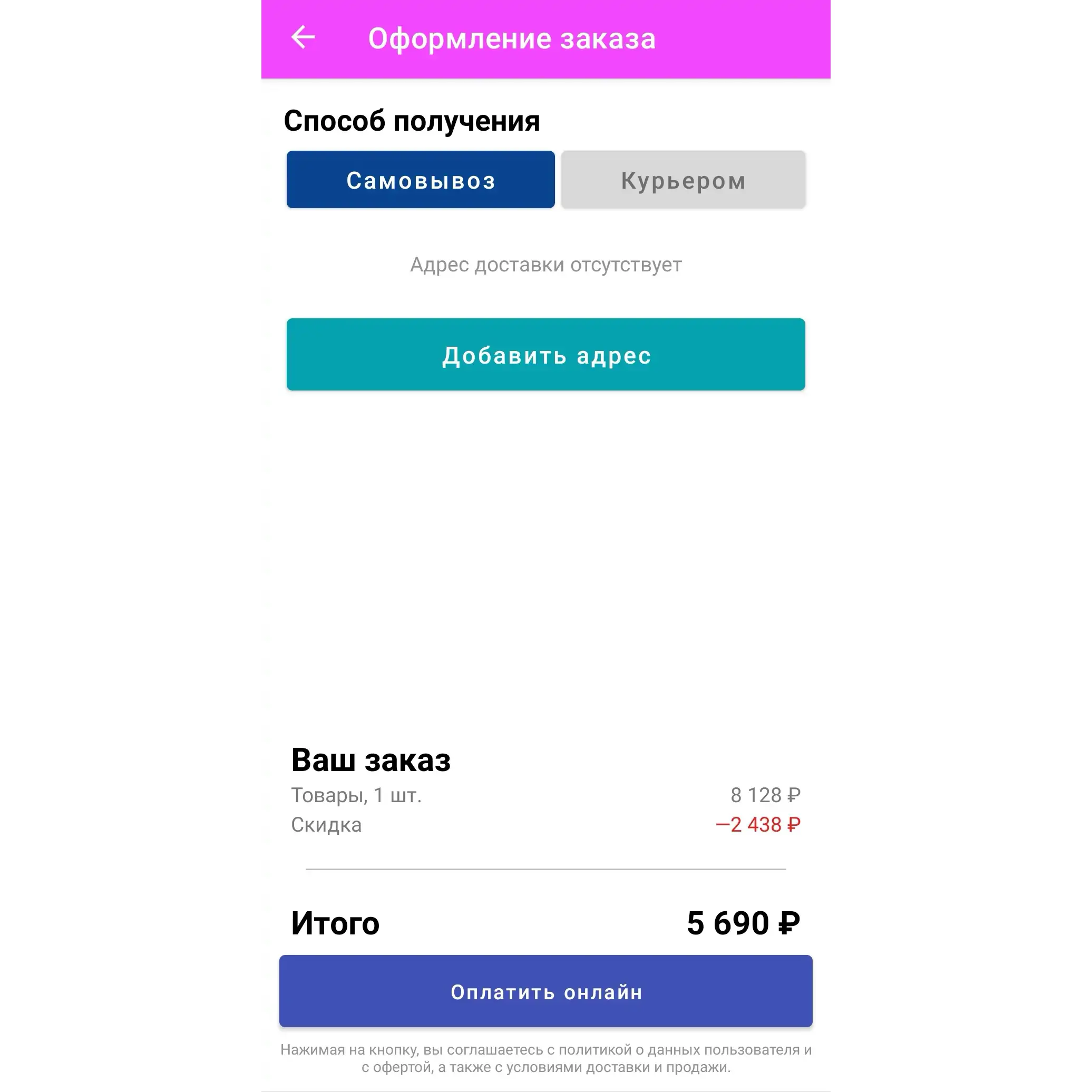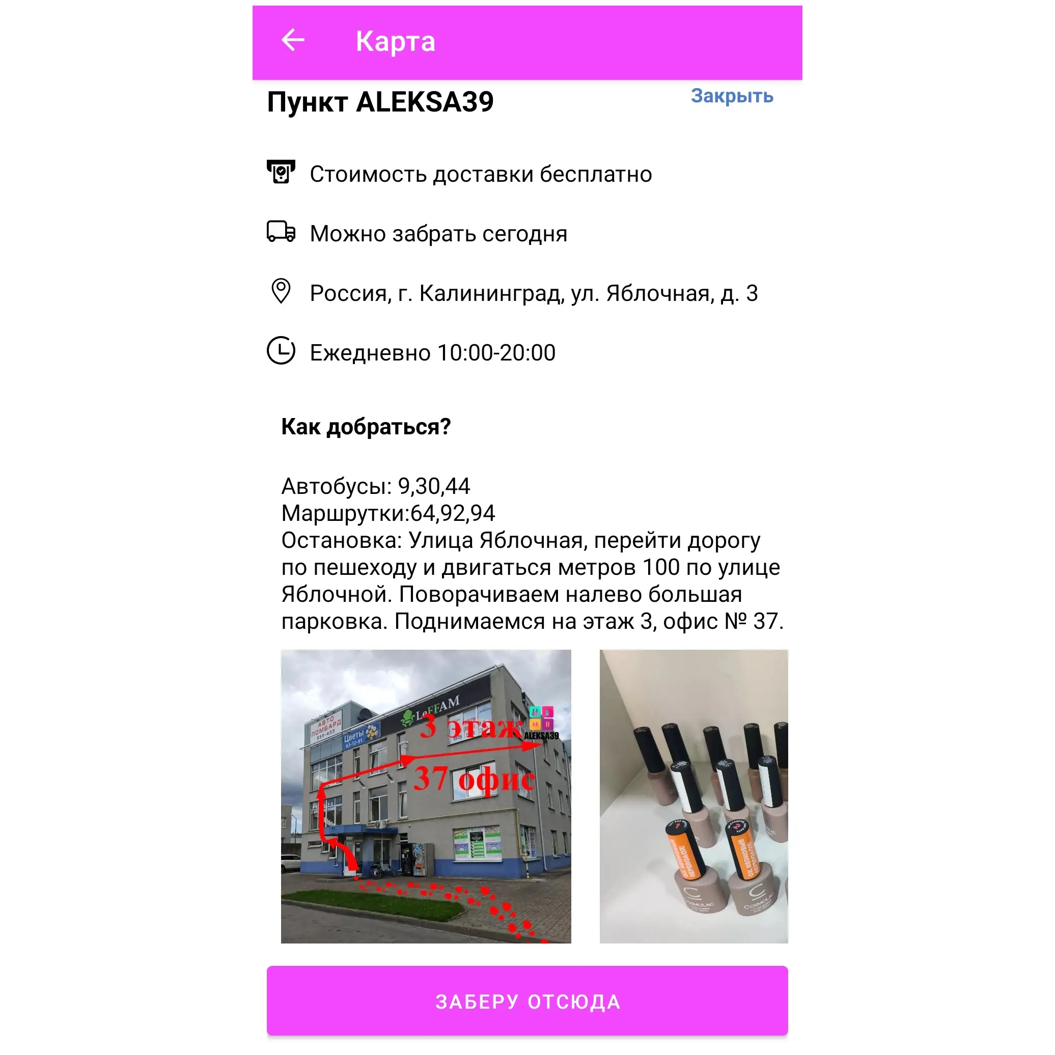 Вы можете самостоятельно забрать свой товар с нашего магазина, который находится по адресу: г. Калининград, ул. Яблочная, д. 3, эт. 3, офис № 37.