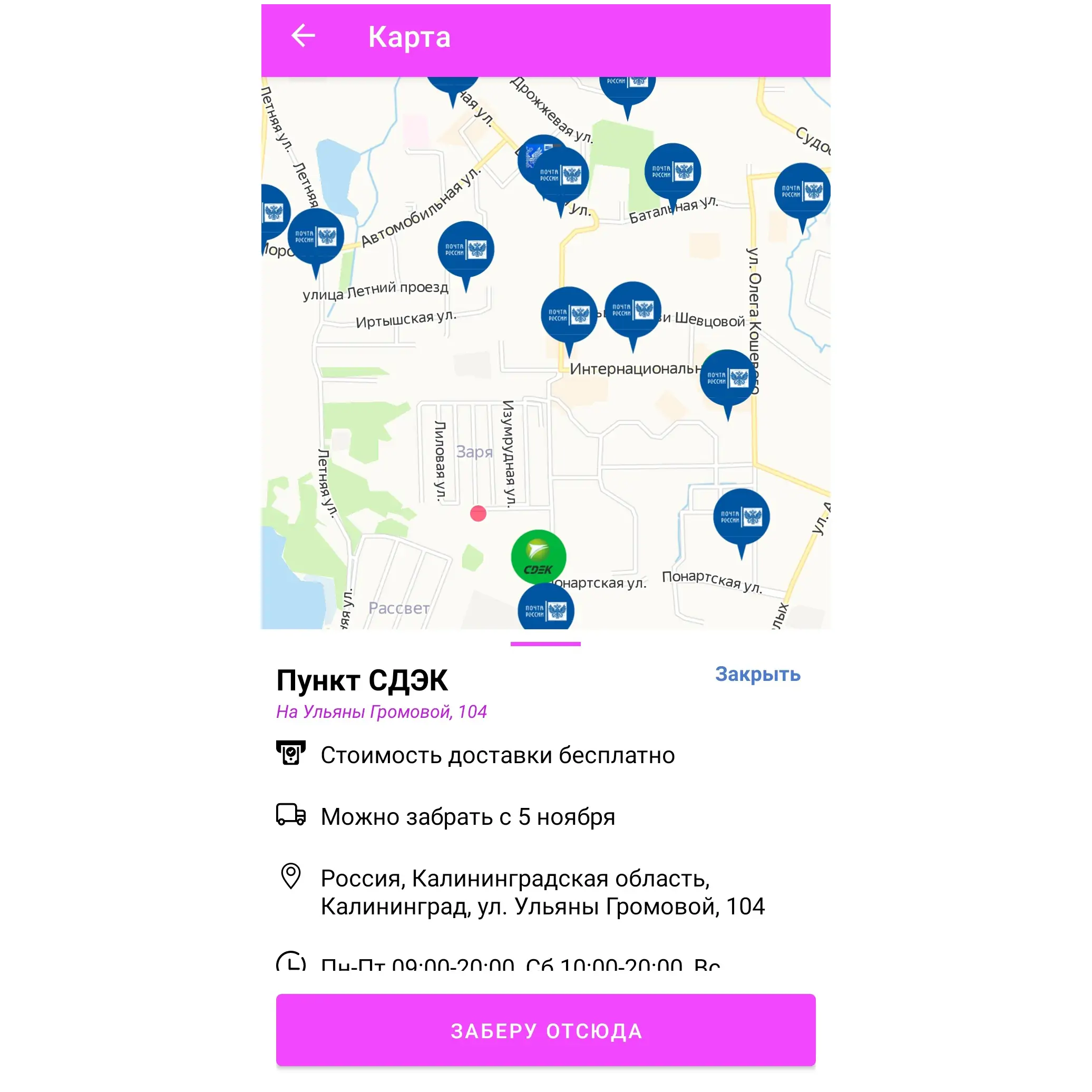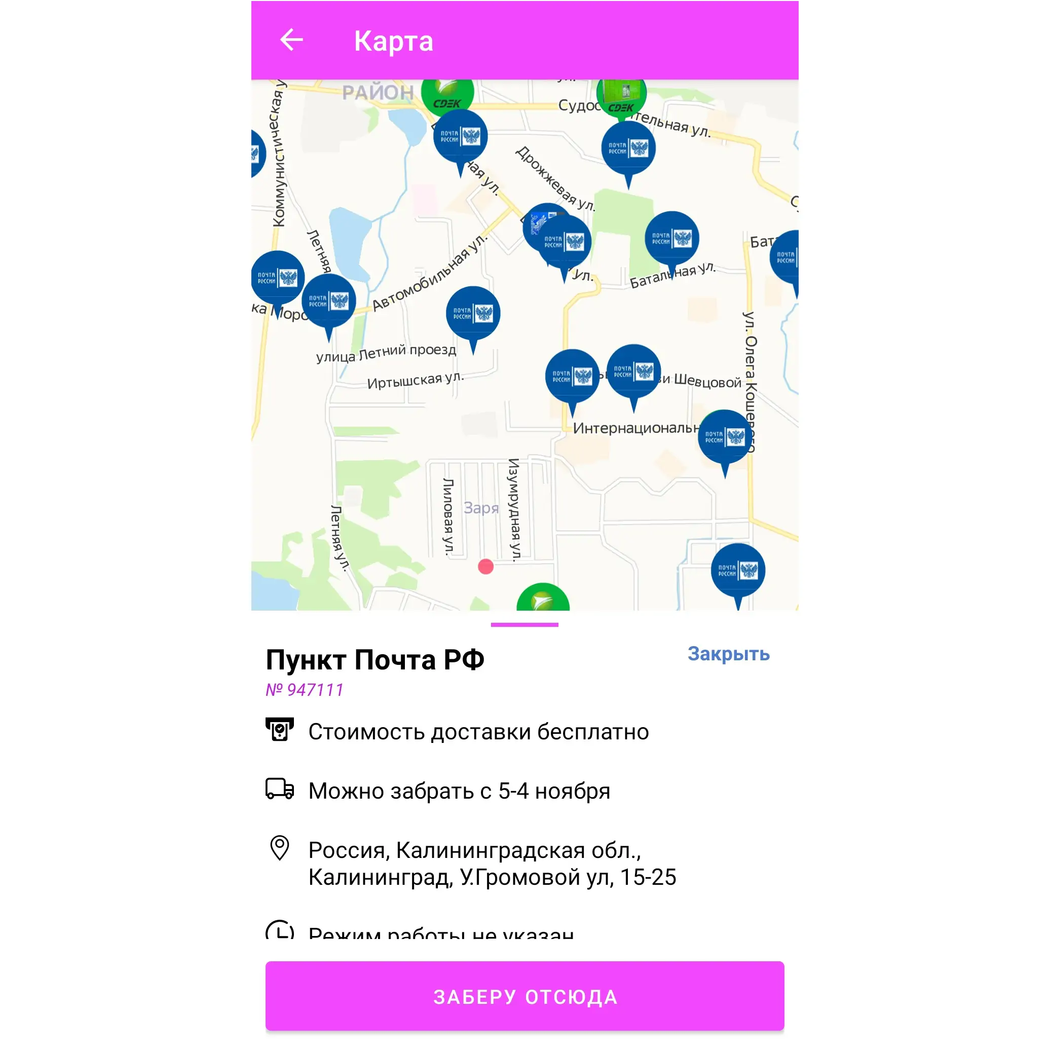 Вы можете забрать товар в одном из пунктов выдачи наших партнеров почты России или СДЭК. Точки самовывоза будут указаны на карте в корзине в специальном окне. Когда заказ поступит в ваш город, вам придёт уведомление. Вы просто идёте по адресу выбранному вами пункта самовывоза, обращаетесь к сотруднику и называете трек номер вашего заказа, который вы также увидите в личном кабинете в заказах.