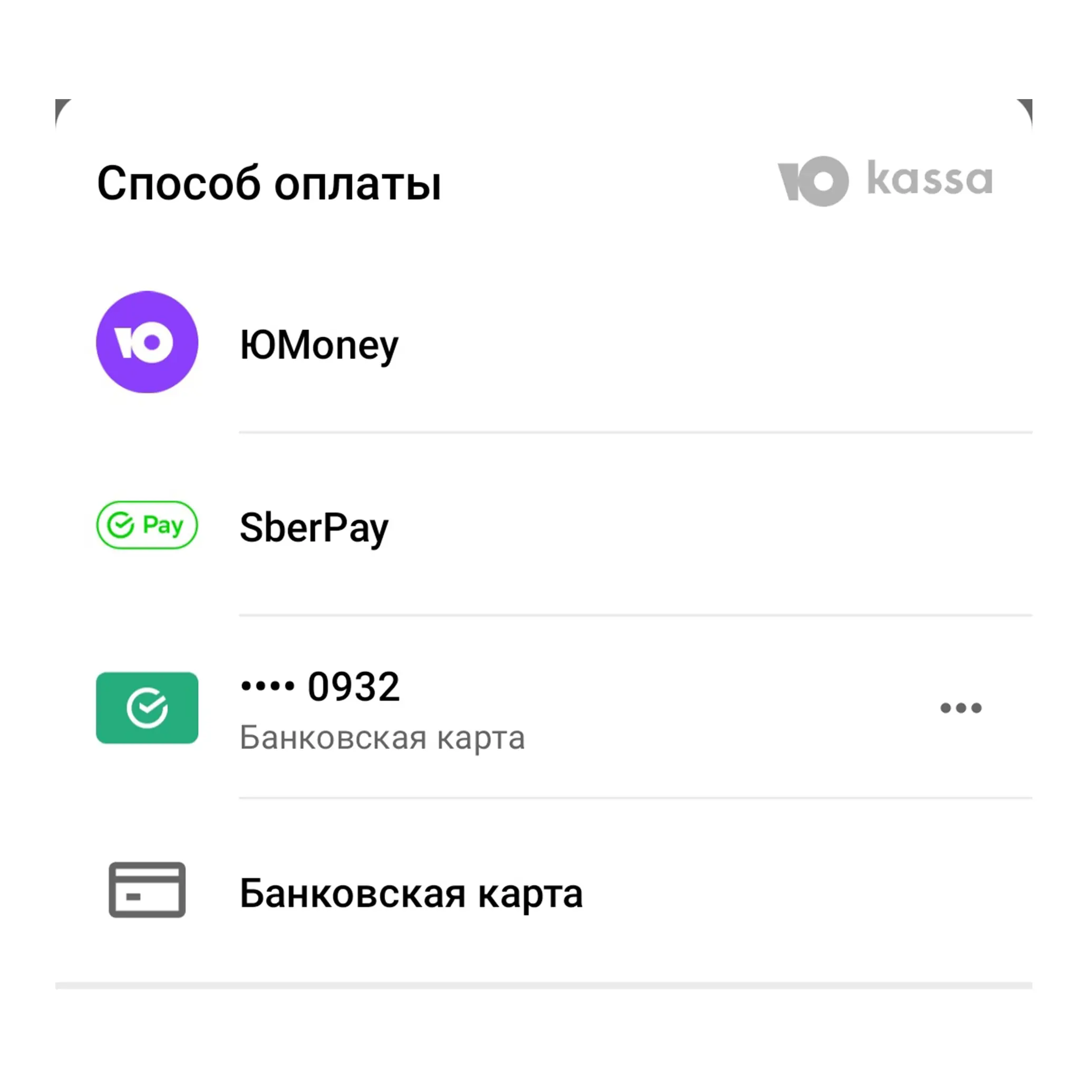 ЮKassa умеет принимать платежи разными способами: с банковских карт, из электронных кошельков, с баланса мобильного телефона, в кредит или рассрочку, наличными, выставлять счета в интернет-банке.
