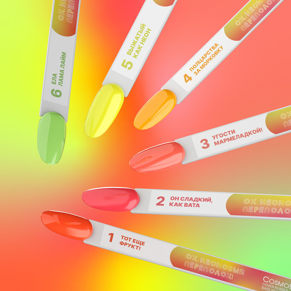 Ох, неоновый переполох! Новая коллекция ярких неоновых камуфлирующих баз Cover Rubber Base Neon - сочетание сочных, летних оттенков с эффектом полупрозрачности. База хорошо камуфлирует ногтевую пластину и при этом сохраняет эффект глубины. Преимущества для профи: густая консистенция; не течет, держится в капле; самовыравнивается; плотно камуфлирует ноготь; прочная сцепка с натуральным ногтем; неоновый оттенок и желейный эффект; Преимущества для клиента: супермодный образ, трендовые летние оттенки; супербыстрый маникюр; суперстойкое, яркое долговременное покрытие до 4-х недель; минимальная нагрузка на ногтевую пластину; не требует нанесения гель-лака;